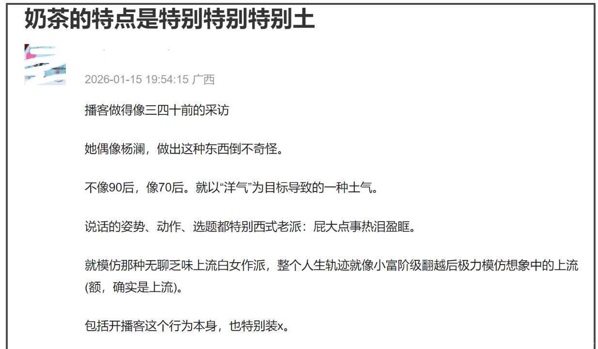 有人觉得奶茶的教育缺少挫折的经历,也许是因为她没经历过上班,也没接触过那些社会的阴暗面,所以她看起来挺单纯、空泛,又有点天真。