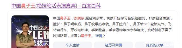 刘晓东 早在《星光大道》开始前,刘晓东就是一个名人了。 他不仅能用鼻子喝水、唱歌还能用鼻子为车胎打气等杂技。 最牛的是,他的鼻子能拉动3吨重的小汽车。 为此他获得了一个十分响亮的称号—“中国鼻子王”。